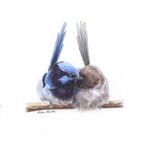 This heartwarming illustration captures an intimate moment between a pair of superb fairy-wrens as they huddle together in an endearing display of affection. Robyn Clarke's detailed rendering showcases the birds' characteristic tails held high in their signature pose, while their bodies nestle closely together on a weathered branch.